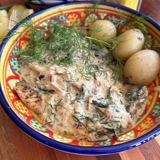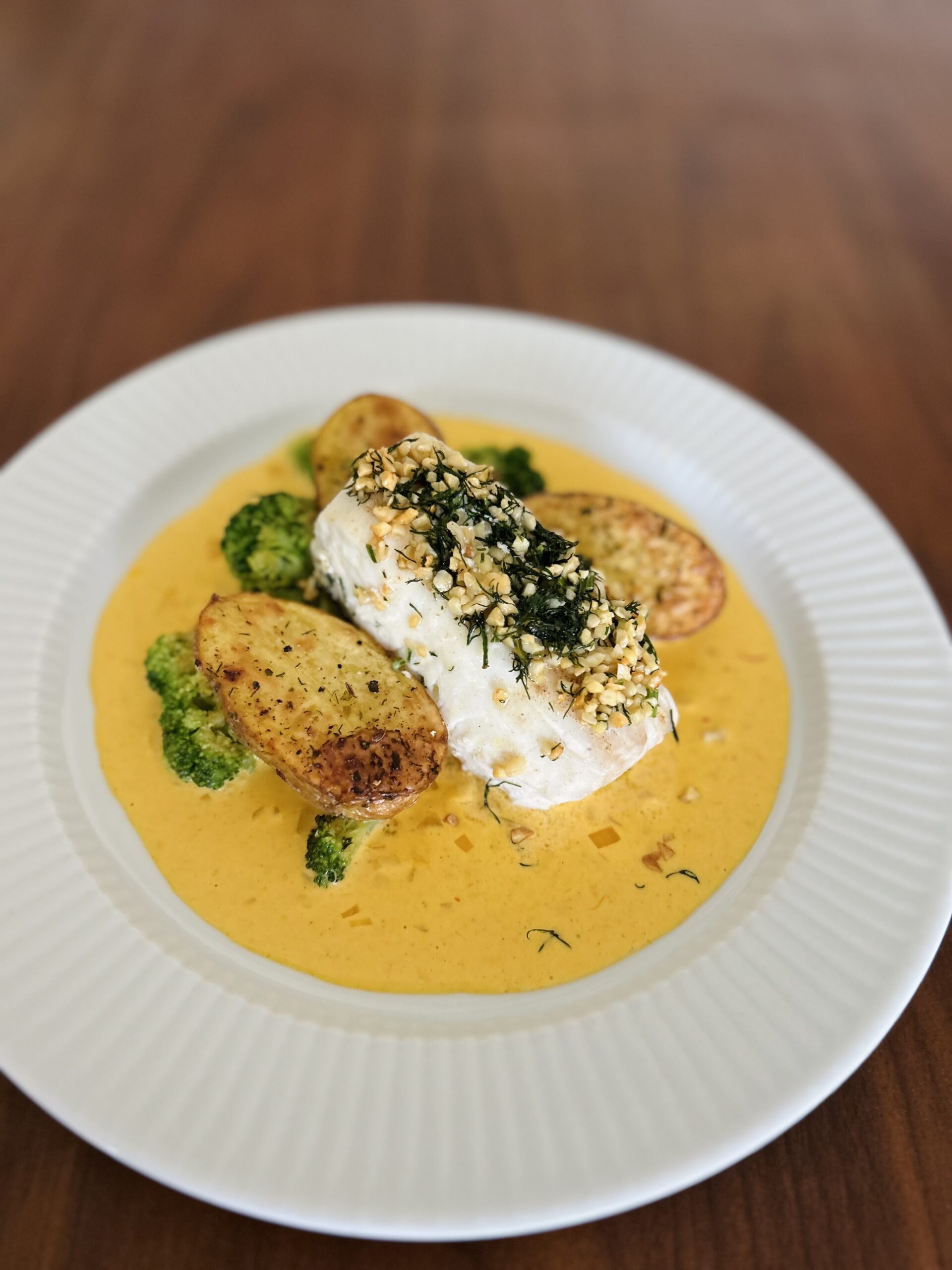 Dill- & pinjeöverbakad hälleflundra med saffransås
