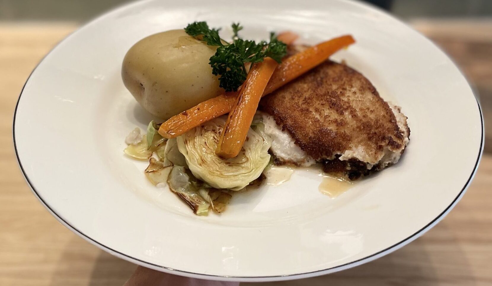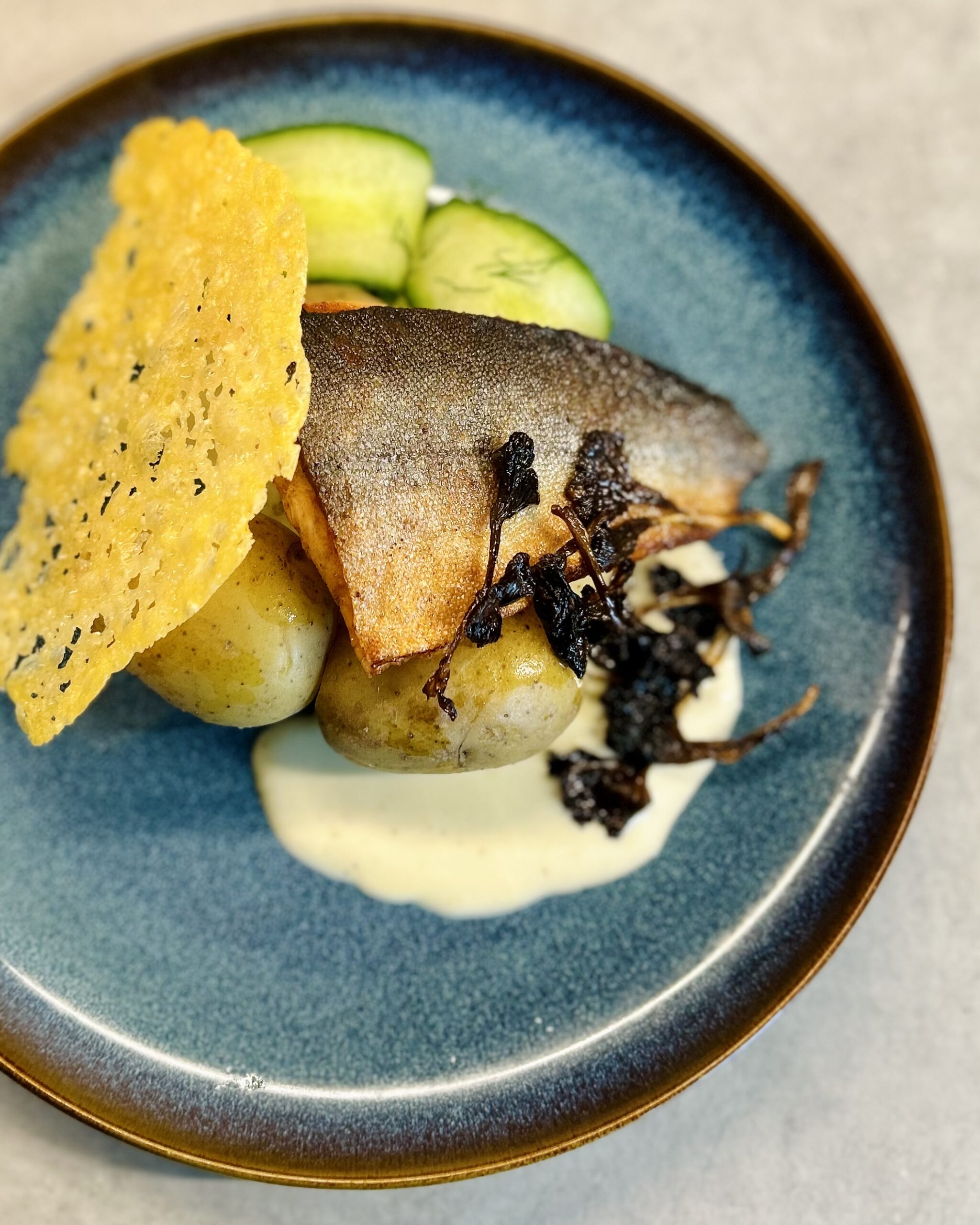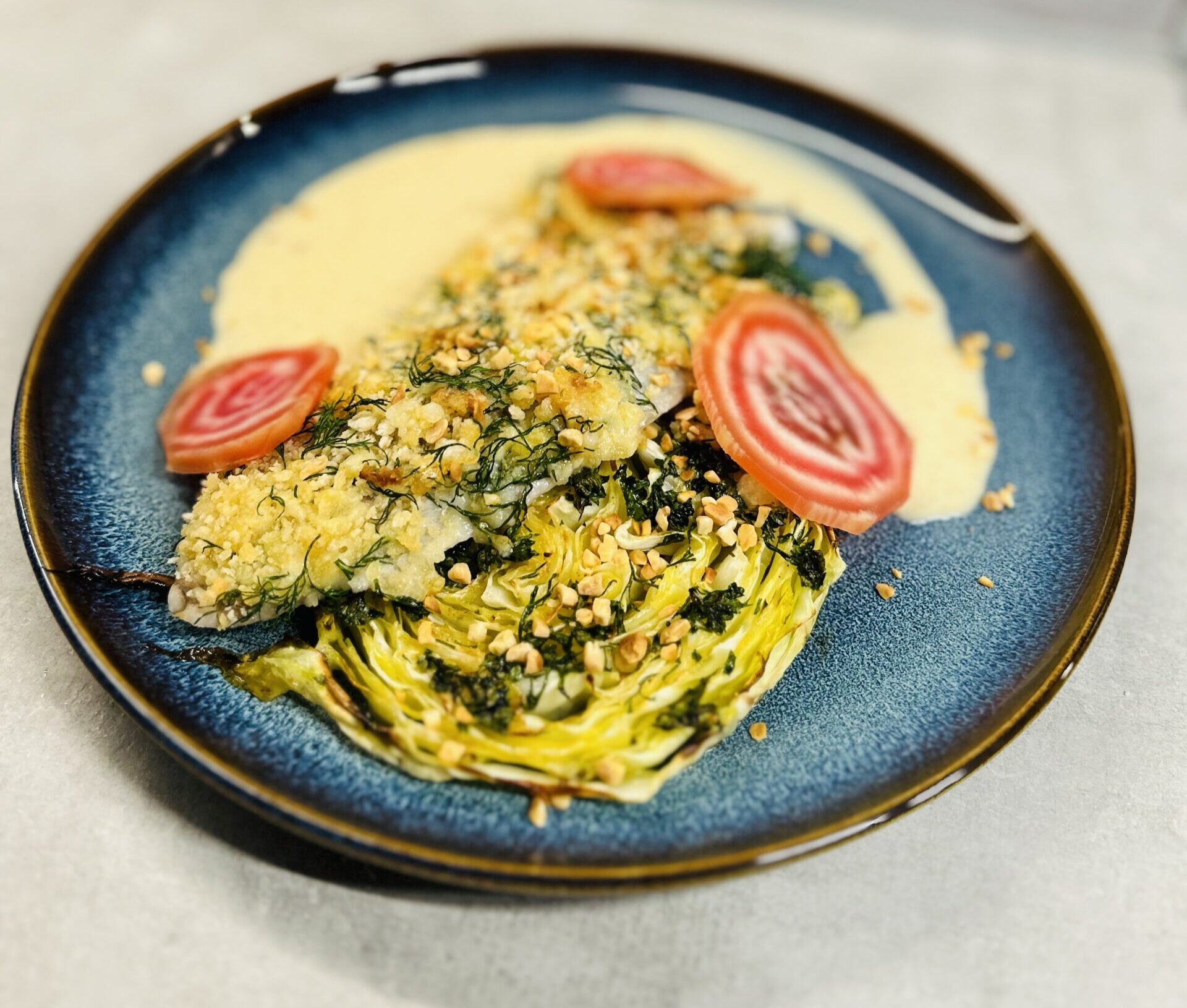 Ostöverbakad sejfilé med rostad spetskål och brynt smör-sandefjordsås