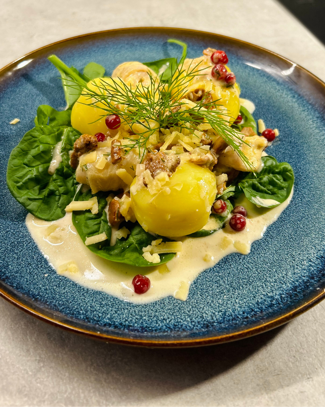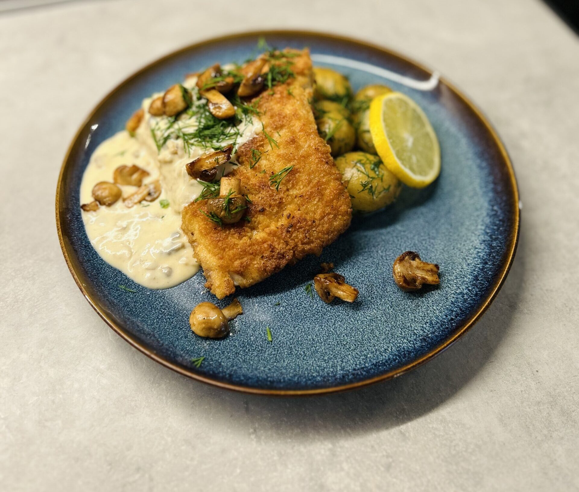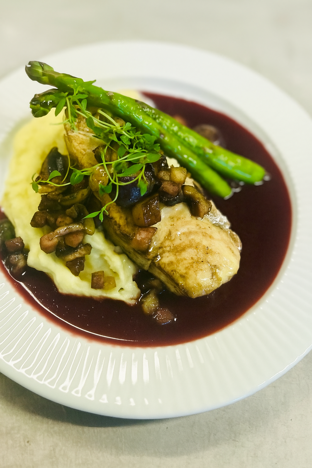 Ostöverbakad sejfilé med rostad spetskål och brynt smör-sandefjordsås