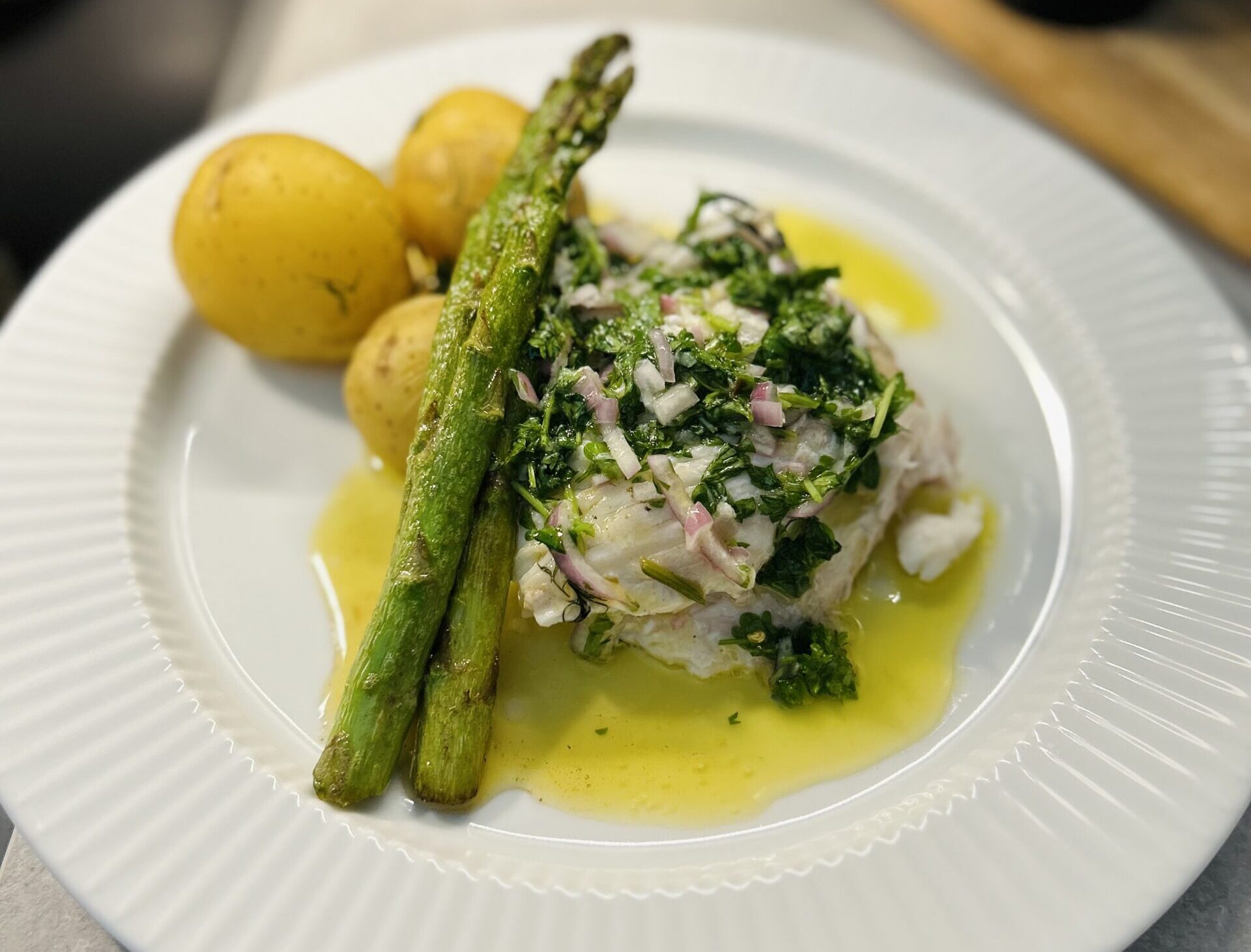 Halstrad hälleflundra med dillslungad potatis och gremolata