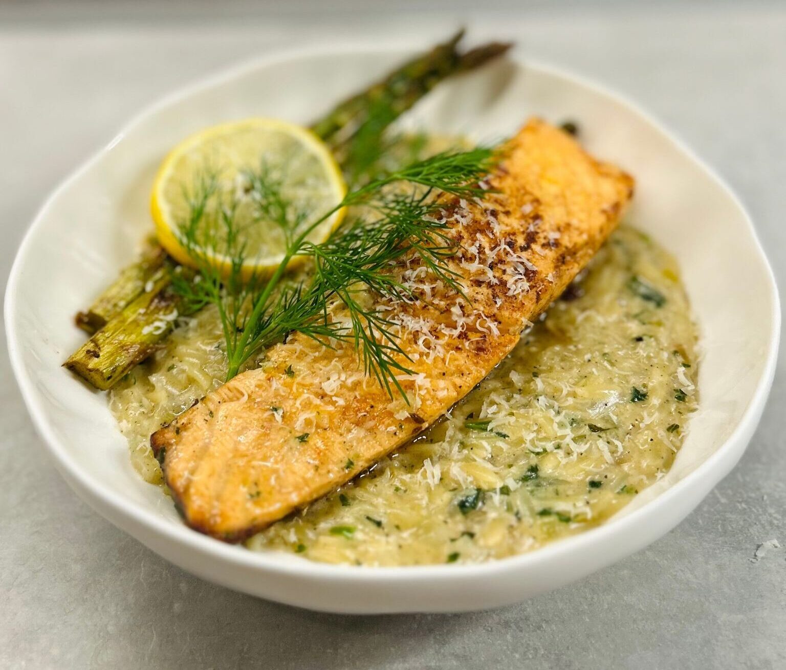 Gremoulatabakad fiskfilé med parmesanrisotto och tomat-olivsås