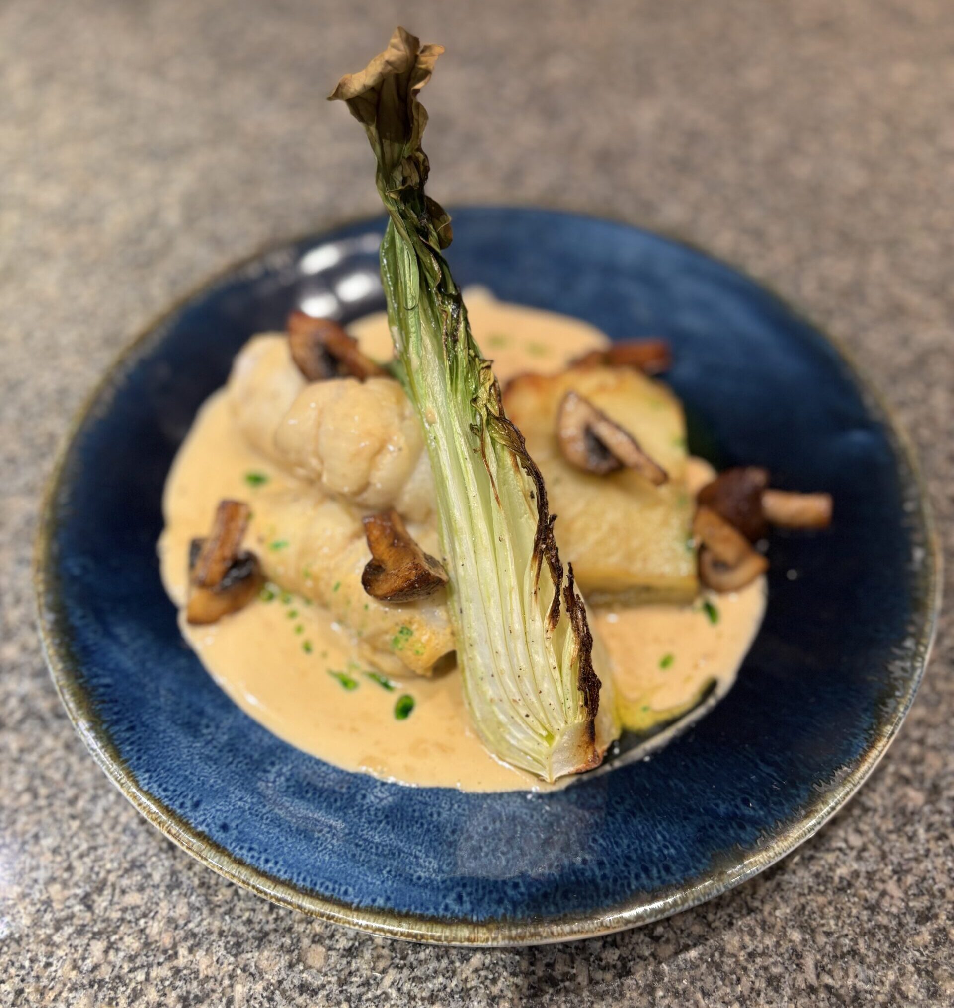 Rödtunga i skaldjurssås med pommes Anna, fräst svamp och bakad pak choi